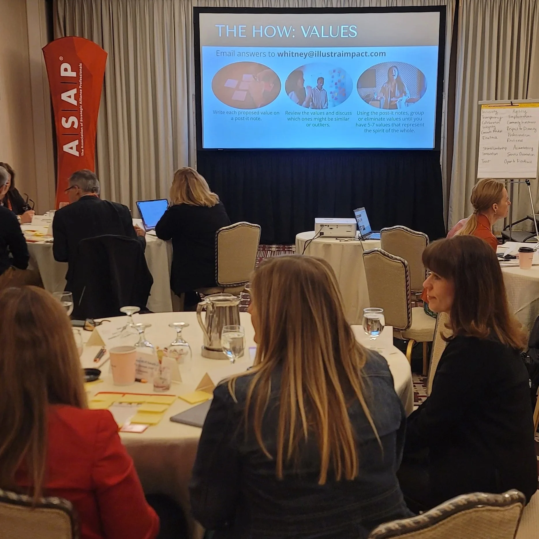 But the most dynamic work emerged during the in-person session focused on core values, the principles for how ASAP fulfills its mission. Board members reflected in table groups on questions like: